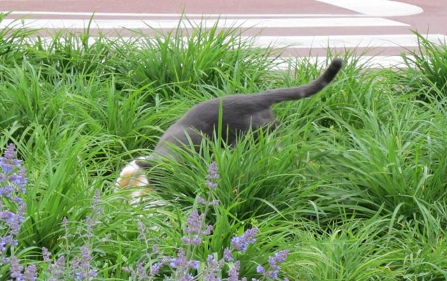 Terwijl de Boez zich vermaakte in de Muizentuin (wij hopen tenminste dat hij zich daar vermaakte, want zoals u misschien wel weet kunnen wij niet in deze tuin kijken om te zien wat zich daar nu precies allemaal afspeelt), zagen wij dat Oscar zich aan het amuseren was in de Kruidentuin met..... Monster! Ze vlogen als gekken achterelkaar aan, sprongen over en langs de struiken, doken eveneens regelmatig op elkaar en lagen dan wat te rollebollen samen. Het ging er hard aan toe, want tijdens dat rollebollen hoorden wij kreetjes die vast en zeker 'auw' betekenden! Tenminste, dat dacht mevrouw Katblad. De fotograaf kon dat niet bevestigen.