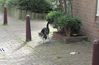 Ha! Bel de Franskat is ook weer in het land. Hij is lang op vakantie geweest, en nu heeft hij de zware taak om zijn territorium (de katbladbuurt en nog een stukkie daarbij) weer te markeren. Ja, want als je zo lang weg bent geweest, zijn al jouw geuren verdwenen, maar bovendien moet je ook gaan vaststellen wie er allemaal zijn langsgeweest, hoe vaak dat was etc. Nou, begin daar maar eens aan, heh? Maar het moet wel gebeuren, en een beetje snel ook, anders kun je niet je status als "Schrik van de Buurt" behouden, wel? Daarom dus.