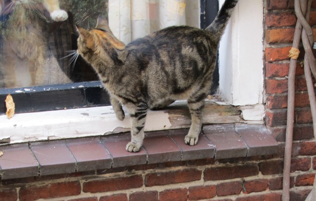 Nou, dat was even schrikken voor Cera, want terwijl zij bezig was Luna te bespieden (die in haar huis voor het raam zat), kwam net het mens van Luna naar het venster toegelopen en tilde Luna op. Helaas kregen wij geen tijd om de kwaaie kop van de - eveneens geschrokken - oude dame te fotograferen, maar zien op bijgaand plaatje nog net haar snorharen, 1 voorpoot en....... haar buikje! En Cera? Wel, die stond al helemaal klaar om een lel uit te delen (voor het geval en desnoods dwars door het glas heen), maar kreeg onverwacht de gelegenheid een blik te werpen op dit o zo intieme deel van Luna, en kan zich waarschijnlijk nu de enige haarfabriek noemen die ooit van zó dichtbij de complete buik van Luna mocht aanschouwen! Toen wij haar echter later naar deze ervaring vroegen, mompelde ze iets over "vieze ramen" en maakte ons duidelijk dat zij deze gebeurtenis geheim wenst te houden en dus met niemand wenst te delen. Wij verzoeken u derhalve om dit hele bericht zo spoedig mogelijk te vergeten en vooral aan niemand door te vertellen. Luna hebben wij niet meer gesproken, maar we vermoeden dat zij het helemaal eens zal zijn met dit verzoek.
