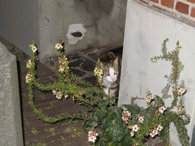 Os zat in het struikgewas in de Kruidentuin, kwam heel even tevoorschijn maar kroop toen weer weg zodat mevrouw K. met alleen Cera en de Boez (en o ja, het hij-mens was er ook) huiswaarts moest keren. Gelukkig wisten wij tenminste waar de Os zat, maar leuk was het niet om hem daar achter te laten. Uiteraard hebben wij het luikje gedurende de nacht niet afgesloten en is Oscar ergens in de vroege ochtenduren huiswaarts gekeerd. Vervolgens heeft hij het grootste deel van de dag onder het Poezenloket in een plantenpot liggen sluimeren. We staan voor een raadsel en roepen hem alsmaar toe dat wij heel veel van hem houden; meer kunnen wij immers niet doen en bovendien menen wij het natuurlijk ook nog uit de grond van ons hart...
